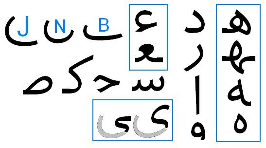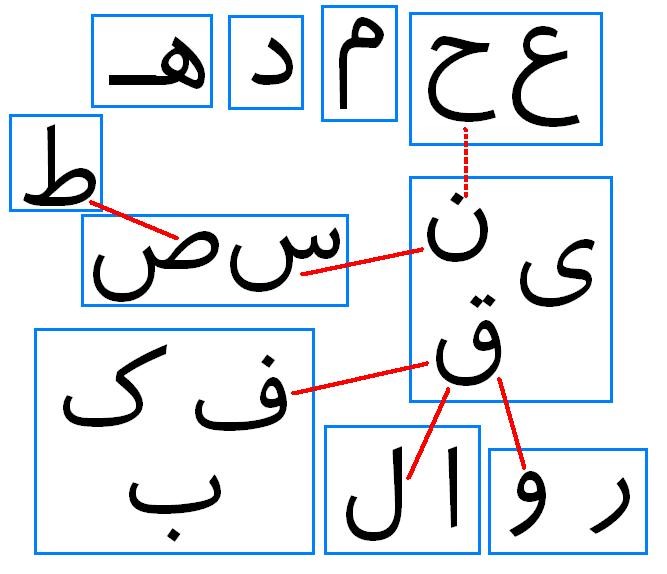 مستطیل‌ها هم خانواده‌ها را نشان می‌دهند، در عین حال حروف غیر هم خانواده نیز شباهت‌هایی دارند. خطوط قرمز این وابستگی‌ها را نمایش می‌دهند. خط چین بین «ح» و «ن» نشانگر این است که کمان‌های این دو گروه نه کاملاً جدا هستند و نه کاملاً یکسان.