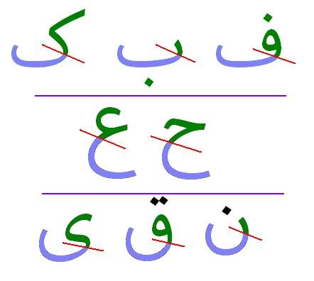 آ ا – ب پ ت ث – ج چ ح خ – د ذ – ر ز ژ – س ش – ص ض – ط ظ – ع غ – ف ق – ک گ – ل م ن و هـ ی