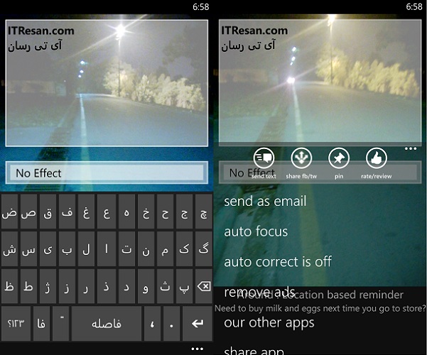 همچون مارکت غنی اندروید در مارکت ویندوزفون نیز نرم افزارهای مشابهی یافت می‌شود اما این نسخه یکی از بهترین‌ها در رده خود محسوب می‌شود! شما می‌توانید هنگام تایپ متن آن را بصورت SMS و یا ایمیل ارسال کنید! از جمله نقاط قوت این نسخه می‌توان به روان بودن حرکات دوربین در پس زمینه اشاره کرد، در حالی که در نسخه اندرویدی تصاویر با کندی محسوسی به نمایش در می‌آِیند! اما بر خلاف نسخه اندرویدی این نرم افزار قادر نیست در تمام منوها تصویر دوربین را در پس زمینه قرار دهد و به ناچار مجبور به استفاده از محیط نرم افزار جهت تایپ متن بوده و بایستی سپس آن را به صورت SMS درآورید!